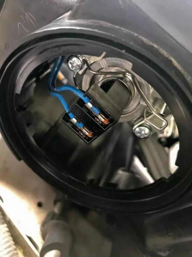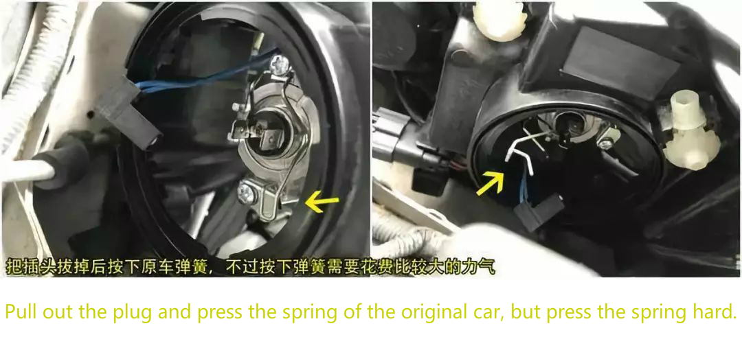 2)Puxe a tampa revestida de borracha para proteger o alojamento do farol da umidade. Em seguida, retire o plugue e pressione para baixo na primavera do carro original usado para consertar a lâmpada.